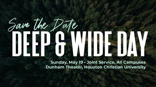 As we look forward to celebrating the life of a great man of God, we are planning to celebrate a great two years of our Deep & Wide Generosity Initiative. More details still to come, but Sunday, May 19 will be Deep & Wide Day, an all-church, joint worship service at Houston Christian University. Please mark your physical or digital calendar for this special morning where we will all gather as one church family, worshiping, praising, and celebrating our God and His blessings and vision together.