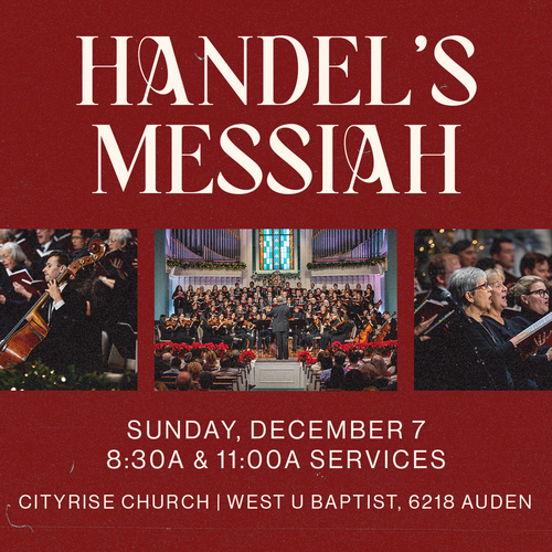 And speaking of events, this Sunday, December 7, will be one of our favorite Christmas kickoff highlights: our annual presentation of Handel’s Messiah. If you’ve been attending CityRise for a while, you know that “Messiah Sunday” is a Christmas tradition at our West U Baptist campus going back over sixty years. Handel’s timeless piece sets the tone for the season and reminds us of the beauty and magnitude of God coming to dwell among us.