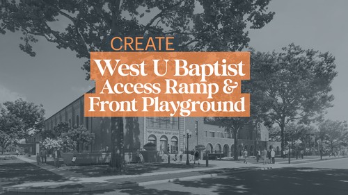 The proposed exterior improvements for the West U Baptist campus are essential steps in creating a space of radical and universal welcome right at our front door. The work includes installing a handicap access ramp to ensure that all individuals, from needing wheelchair access to pushing a stroller, have clear, safe access to the building. This eliminates physical barriers, affirming our commitment to serving every person God sends us. Simultaneously, we are building a beautiful, amazing playground on the front yard at Milton. The need for this is strategic: the playground acts as a powerful beacon that says to young families, "We want you to come in!" By investing in these visible and practical additions, we are changing the impression and curb appeal of our campus, and as the sun sets and evening emerges, we will light up the front of our church as a beacon for the community to see. This effort is not just updating buildings—it is positioning this campus for the next generation of ministry.